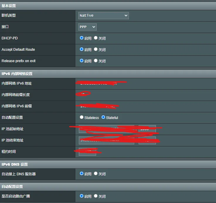 native:使用自己路由拨号的时候下选择,看起来应该是路由下每台机器都有独立原生ipv6;